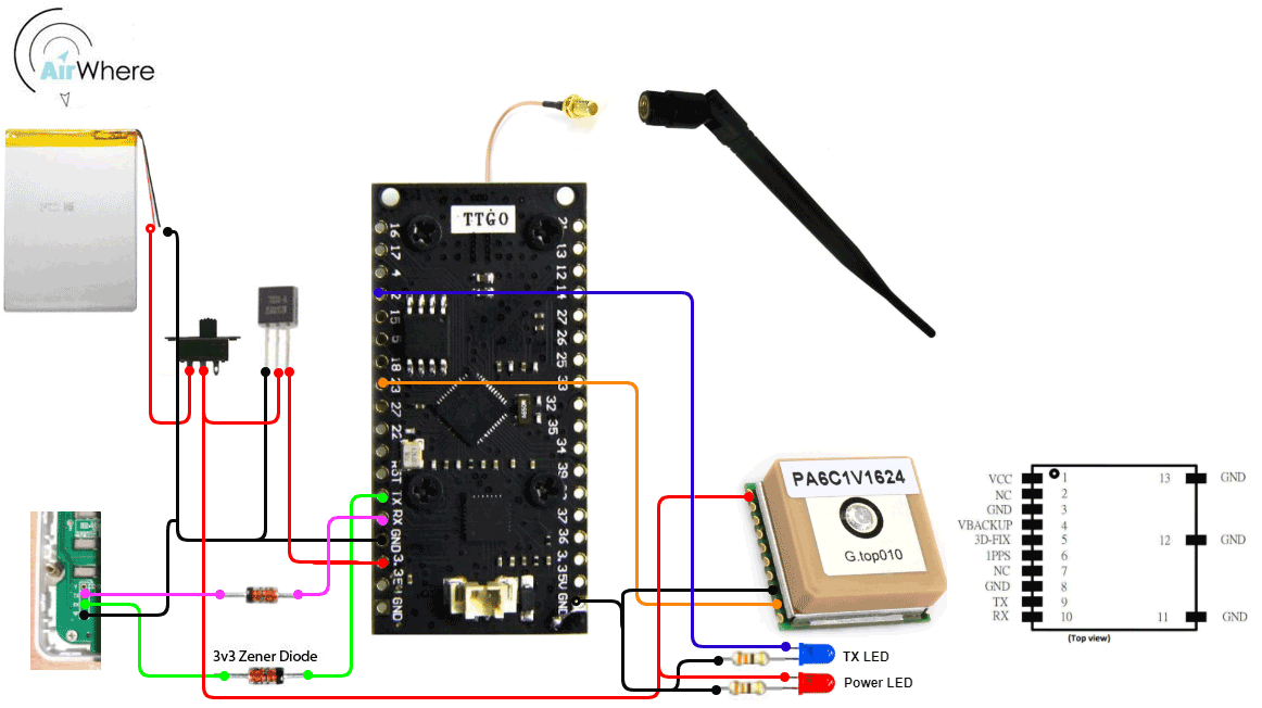 Follow the wiring diagram to setup the AirWhere board. a breadboard can be used to temporarily check the system works ok, however soldering gives a better joint.